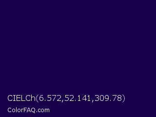 CIELCh 6.572,52.141,309.78 Color is a very dark violet color and the nearest color is Tolopea #1b0245. Hex code #1a004b and RGB value is rgb(26,0,75). In RGB color space, this color is composed of 10% red, 0% green, 29% blue, In CMYK color space, this color is composed of 65% cyan, 100% magenta, 0% yellow , 71% black , In HSL color space, this color has a hue angle of 261° , 100% saturation and 15% lightness.