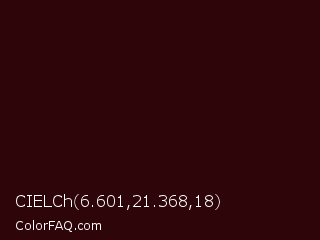 CIELCh 6.601,21.368,18 Color is a very dark red color and the nearest color is Sepia Black #2b0202. Hex code #2e0609 and RGB value is rgb(46,6,9). In RGB color space, this color is composed of 18% red, 2% green, 4% blue, In CMYK color space, this color is composed of 0% cyan, 87% magenta, 80% yellow , 82% black , In HSL color space, this color has a hue angle of 356° , 77% saturation and 10% lightness.