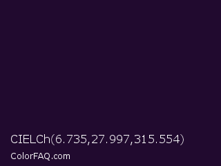 CIELCh 6.735,27.997,315.554 Color is a very dark purple color and the nearest color is Haiti #1b1035. Hex code #210a2f and RGB value is rgb(33,10,47). In RGB color space, this color is composed of 13% red, 4% green, 18% blue, In CMYK color space, this color is composed of 30% cyan, 79% magenta, 0% yellow , 82% black , In HSL color space, this color has a hue angle of 277° , 65% saturation and 11% lightness.