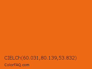 CIELCh 60.031,80.139,53.832 Color is a normal orange color and the nearest color is Christine #e7730a. Hex code #ed6914 and RGB value is rgb(237,105,20). In RGB color space, this color is composed of 93% red, 41% green, 8% blue, In CMYK color space, this color is composed of 0% cyan, 56% magenta, 92% yellow , 7% black , In HSL color space, this color has a hue angle of 24° , 86% saturation and 50% lightness.