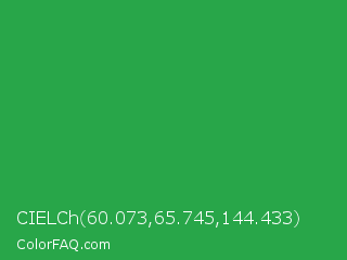 CIELCh 60.073,65.745,144.433 Color is a normal green color and the nearest color is Wageningen Green #34b233. Hex code #28a649 and RGB value is rgb(40,166,73). In RGB color space, this color is composed of 16% red, 65% green, 29% blue, In CMYK color space, this color is composed of 76% cyan, 0% magenta, 56% yellow , 35% black , In HSL color space, this color has a hue angle of 136° , 61% saturation and 40% lightness.
