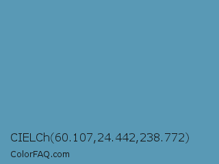 CIELCh 60.107,24.442,238.772 Color is a normal blue color and the nearest color is Hippie Blue #589aaf. Hex code #5999b5 and RGB value is rgb(89,153,181). In RGB color space, this color is composed of 35% red, 60% green, 71% blue, In CMYK color space, this color is composed of 51% cyan, 15% magenta, 0% yellow , 29% black , In HSL color space, this color has a hue angle of 198° , 38% saturation and 53% lightness.