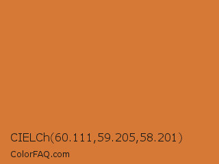 CIELCh 60.111,59.205,58.201 Color is a normal orange color and the nearest color is Bronze #cd7f32. Hex code #d67937 and RGB value is rgb(214,121,55). In RGB color space, this color is composed of 84% red, 47% green, 22% blue, In CMYK color space, this color is composed of 0% cyan, 43% magenta, 74% yellow , 16% black , In HSL color space, this color has a hue angle of 25° , 66% saturation and 53% lightness.