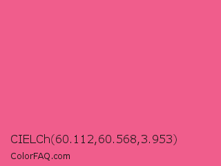 CIELCh 60.112,60.568,3.953 Color is a light rose color and the nearest color is Strawberry #fc5a8d. Hex code #f05d8c and RGB value is rgb(240,93,140). In RGB color space, this color is composed of 94% red, 36% green, 55% blue, In CMYK color space, this color is composed of 0% cyan, 61% magenta, 42% yellow , 6% black , In HSL color space, this color has a hue angle of 341° , 83% saturation and 65% lightness.