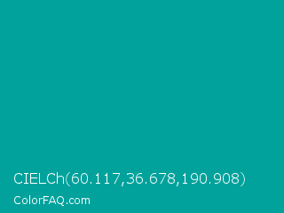 CIELCh 60.117,36.678,190.908 Color is a normal cyan color and the nearest color is Persian Green #00a693. Hex code #02a29c and RGB value is rgb(2,162,156). In RGB color space, this color is composed of 1% red, 64% green, 61% blue, In CMYK color space, this color is composed of 99% cyan, 0% magenta, 4% yellow , 36% black , In HSL color space, this color has a hue angle of 178° , 98% saturation and 32% lightness.