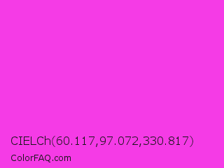 CIELCh 60.117,97.072,330.817 Color is a normal magenta color and the nearest color is Purple Pizzazz #fe4eda. Hex code #f53be6 and RGB value is rgb(245,59,230). In RGB color space, this color is composed of 96% red, 23% green, 90% blue, In CMYK color space, this color is composed of 0% cyan, 76% magenta, 6% yellow , 4% black , In HSL color space, this color has a hue angle of 305° , 90% saturation and 60% lightness.