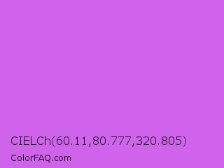 CIELCh 60.11,80.777,320.805 Color is a light purple color and the nearest color is Orchid #da70d6. Hex code #cf63ec and RGB value is rgb(207,99,236). In RGB color space, this color is composed of 81% red, 39% green, 93% blue, In CMYK color space, this color is composed of 12% cyan, 58% magenta, 0% yellow , 7% black , In HSL color space, this color has a hue angle of 287° , 78% saturation and 66% lightness.