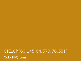 CIELCh 60.145,64.573,76.581 Color is a normal orange color and the nearest color is Dark Goldenrod #b8860b. Hex code #c28511 and RGB value is rgb(194,133,17). In RGB color space, this color is composed of 76% red, 52% green, 7% blue, In CMYK color space, this color is composed of 0% cyan, 31% magenta, 91% yellow , 24% black , In HSL color space, this color has a hue angle of 39° , 84% saturation and 41% lightness.