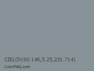 CIELCh 60.146,5.25,231.714 Color is a normal blue color and the nearest color is Regent Gray #86949f. Hex code #879398 and RGB value is rgb(135,147,152). In RGB color space, this color is composed of 53% red, 58% green, 60% blue, In CMYK color space, this color is composed of 11% cyan, 3% magenta, 0% yellow , 40% black , In HSL color space, this color has a hue angle of 198° , 8% saturation and 56% lightness.