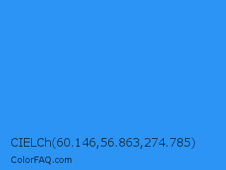 CIELCh 60.146,56.863,274.785 Color is a normal blue color and the nearest color is Brilliant Azure #3399ff. Hex code #2b94f5 and RGB value is rgb(43,148,245). In RGB color space, this color is composed of 17% red, 58% green, 96% blue, In CMYK color space, this color is composed of 82% cyan, 40% magenta, 0% yellow , 4% black , In HSL color space, this color has a hue angle of 209° , 91% saturation and 56% lightness.