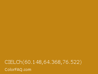 CIELCh 60.148,64.368,76.522 Color is a normal orange color and the nearest color is Dark Goldenrod #b8860b. Hex code #c28512 and RGB value is rgb(194,133,18). In RGB color space, this color is composed of 76% red, 52% green, 7% blue, In CMYK color space, this color is composed of 0% cyan, 31% magenta, 91% yellow , 24% black , In HSL color space, this color has a hue angle of 39° , 83% saturation and 42% lightness.