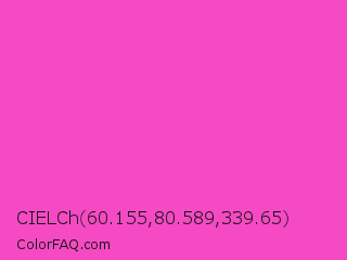 CIELCh 60.155,80.589,339.65 Color is a light magenta color and the nearest color is Light Deep Pink #ff5ccd. Hex code #f54ac4 and RGB value is rgb(245,74,196). In RGB color space, this color is composed of 96% red, 29% green, 77% blue, In CMYK color space, this color is composed of 0% cyan, 70% magenta, 20% yellow , 4% black , In HSL color space, this color has a hue angle of 317° , 90% saturation and 63% lightness.