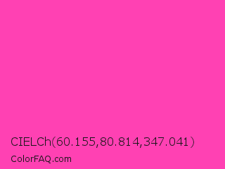 CIELCh 60.155,80.814,347.041 Color is a light magenta color and the nearest color is Wild Strawberry #ff43a4. Hex code #ff41b3 and RGB value is rgb(255,65,179). In RGB color space, this color is composed of 100% red, 25% green, 70% blue, In CMYK color space, this color is composed of 0% cyan, 75% magenta, 30% yellow , 0% black , In HSL color space, this color has a hue angle of 324° , 100% saturation and 63% lightness.