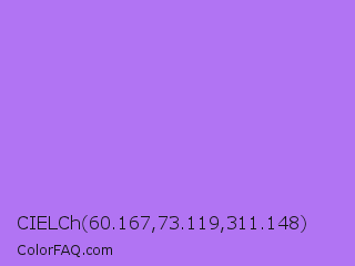 CIELCh 60.167,73.119,311.148 Color is a light violet color and the nearest color is Lavender #b57edc. Hex code #b174f3 and RGB value is rgb(177,116,243). In RGB color space, this color is composed of 69% red, 45% green, 95% blue, In CMYK color space, this color is composed of 27% cyan, 52% magenta, 0% yellow , 5% black , In HSL color space, this color has a hue angle of 269° , 84% saturation and 70% lightness.