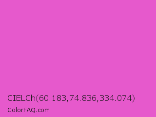 CIELCh 60.183,74.836,334.074 Color is a light magenta color and the nearest color is Light Deep Pink #ff5ccd. Hex code #e659cc and RGB value is rgb(230,89,204). In RGB color space, this color is composed of 90% red, 35% green, 80% blue, In CMYK color space, this color is composed of 0% cyan, 61% magenta, 11% yellow , 10% black , In HSL color space, this color has a hue angle of 311° , 74% saturation and 63% lightness.
