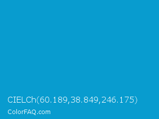 CIELCh 60.189,38.849,246.175 Color is a normal blue color and the nearest color is Rich Electric Blue #0892d0. Hex code #089ccf and RGB value is rgb(8,156,207). In RGB color space, this color is composed of 3% red, 61% green, 81% blue, In CMYK color space, this color is composed of 96% cyan, 25% magenta, 0% yellow , 19% black , In HSL color space, this color has a hue angle of 195° , 93% saturation and 42% lightness.