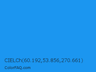 CIELCh 60.192,53.856,270.661 Color is a normal blue color and the nearest color is Button Blue #24a0ed. Hex code #1b96f0 and RGB value is rgb(27,150,240). In RGB color space, this color is composed of 11% red, 59% green, 94% blue, In CMYK color space, this color is composed of 89% cyan, 38% magenta, 0% yellow , 6% black , In HSL color space, this color has a hue angle of 205° , 88% saturation and 52% lightness.