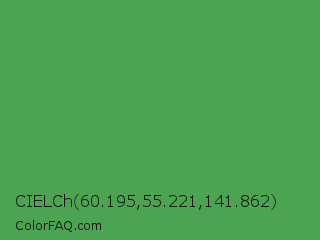 CIELCh 60.195,55.221,141.862 Color is a normal green color and the nearest color is Fruit Salad #4f9d5d. Hex code #4ca352 and RGB value is rgb(76,163,82). In RGB color space, this color is composed of 30% red, 64% green, 32% blue, In CMYK color space, this color is composed of 53% cyan, 0% magenta, 50% yellow , 36% black , In HSL color space, this color has a hue angle of 124° , 36% saturation and 47% lightness.