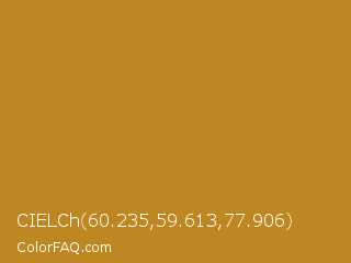 CIELCh 60.235,59.613,77.906 Color is a normal orange color and the nearest color is University Of California Gold #b78727. Hex code #be8721 and RGB value is rgb(190,135,33). In RGB color space, this color is composed of 75% red, 53% green, 13% blue, In CMYK color space, this color is composed of 0% cyan, 29% magenta, 83% yellow , 25% black , In HSL color space, this color has a hue angle of 39° , 70% saturation and 44% lightness.
