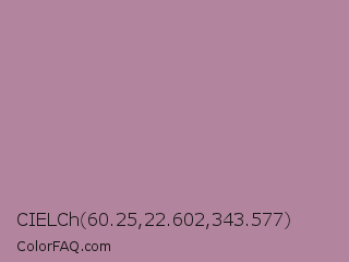 CIELCh 60.25,22.602,343.577 Color is a light magenta color and the nearest color is Bouquet #ae809e. Hex code #b2849d and RGB value is rgb(178,132,157). In RGB color space, this color is composed of 70% red, 52% green, 62% blue, In CMYK color space, this color is composed of 0% cyan, 26% magenta, 12% yellow , 30% black , In HSL color space, this color has a hue angle of 327° , 23% saturation and 61% lightness.