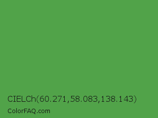 CIELCh 60.271,58.083,138.143 Color is a normal green color and the nearest color is Apple #4fa83d. Hex code #51a349 and RGB value is rgb(81,163,73). In RGB color space, this color is composed of 32% red, 64% green, 29% blue, In CMYK color space, this color is composed of 50% cyan, 0% magenta, 55% yellow , 36% black , In HSL color space, this color has a hue angle of 115° , 38% saturation and 46% lightness.