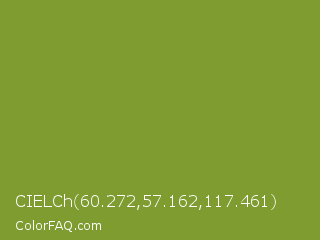 CIELCh 60.272,57.162,117.461 Color is a normal lime color and the nearest color is Sushi #87ab39. Hex code #7e9c30 and RGB value is rgb(126,156,48). In RGB color space, this color is composed of 49% red, 61% green, 19% blue, In CMYK color space, this color is composed of 19% cyan, 0% magenta, 69% yellow , 39% black , In HSL color space, this color has a hue angle of 77° , 53% saturation and 40% lightness.