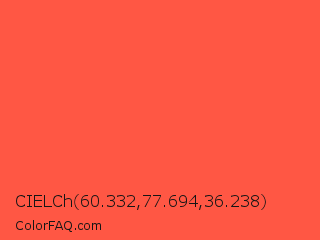 CIELCh 60.332,77.694,36.238 Color is a light red color and the nearest color is Red Orange #ff5349. Hex code #ff5744 and RGB value is rgb(255,87,68). In RGB color space, this color is composed of 100% red, 34% green, 27% blue, In CMYK color space, this color is composed of 0% cyan, 66% magenta, 73% yellow , 0% black , In HSL color space, this color has a hue angle of 6° , 100% saturation and 63% lightness.