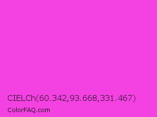 CIELCh 60.342,93.668,331.467 Color is a light magenta color and the nearest color is Purple Pizzazz #fe4eda. Hex code #f441e2 and RGB value is rgb(244,65,226). In RGB color space, this color is composed of 96% red, 25% green, 89% blue, In CMYK color space, this color is composed of 0% cyan, 73% magenta, 7% yellow , 4% black , In HSL color space, this color has a hue angle of 306° , 89% saturation and 61% lightness.