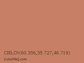 CIELCh 60.356,35.727,46.719 Color is a normal orange color and the nearest color is Antique Brass #c88a65. Hex code #c78065 and RGB value is rgb(199,128,101). In RGB color space, this color is composed of 78% red, 50% green, 40% blue, In CMYK color space, this color is composed of 0% cyan, 36% magenta, 49% yellow , 22% black , In HSL color space, this color has a hue angle of 17° , 47% saturation and 59% lightness.