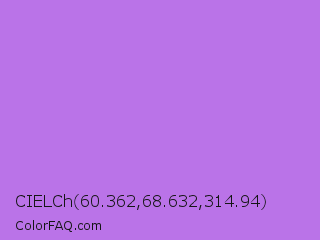 CIELCh 60.362,68.632,314.94 Color is a light purple color and the nearest color is Lavender #b57edc. Hex code #ba73e8 and RGB value is rgb(186,115,232). In RGB color space, this color is composed of 73% red, 45% green, 91% blue, In CMYK color space, this color is composed of 20% cyan, 50% magenta, 0% yellow , 9% black , In HSL color space, this color has a hue angle of 276° , 72% saturation and 68% lightness.