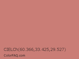 CIELCh 60.366,33.425,29.527 Color is a light red color and the nearest color is Old Rose #c08081. Hex code #ca7d76 and RGB value is rgb(202,125,118). In RGB color space, this color is composed of 79% red, 49% green, 46% blue, In CMYK color space, this color is composed of 0% cyan, 38% magenta, 42% yellow , 21% black , In HSL color space, this color has a hue angle of 5° , 44% saturation and 63% lightness.