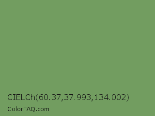 CIELCh 60.37,37.993,134.002 Color is a normal green color and the nearest color is Asparagus Green #7ba05b. Hex code #729d60 and RGB value is rgb(114,157,96). In RGB color space, this color is composed of 45% red, 62% green, 38% blue, In CMYK color space, this color is composed of 27% cyan, 0% magenta, 39% yellow , 38% black , In HSL color space, this color has a hue angle of 102° , 24% saturation and 50% lightness.
