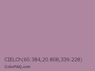 CIELCh 60.384,20.808,339.228 Color is a normal magenta color and the nearest color is Bouquet #ae809e. Hex code #ae869f and RGB value is rgb(174,134,159). In RGB color space, this color is composed of 68% red, 53% green, 62% blue, In CMYK color space, this color is composed of 0% cyan, 23% magenta, 9% yellow , 32% black , In HSL color space, this color has a hue angle of 323° , 20% saturation and 60% lightness.