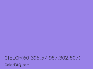 CIELCh 60.395,57.987,302.807 Color is a light indigo color and the nearest color is Medium Purple #9370db. Hex code #9982e8 and RGB value is rgb(153,130,232). In RGB color space, this color is composed of 60% red, 51% green, 91% blue, In CMYK color space, this color is composed of 34% cyan, 44% magenta, 0% yellow , 9% black , In HSL color space, this color has a hue angle of 254° , 69% saturation and 71% lightness.
