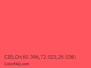 CIELCh 60.396,72.023,26.038 Color is a light red color and the nearest color is Carnation #f95a61. Hex code #ff555e and RGB value is rgb(255,85,94). In RGB color space, this color is composed of 100% red, 33% green, 37% blue, In CMYK color space, this color is composed of 0% cyan, 67% magenta, 63% yellow , 0% black , In HSL color space, this color has a hue angle of 357° , 100% saturation and 67% lightness.
