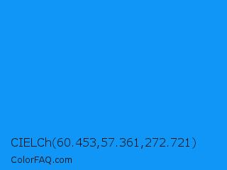 CIELCh 60.453,57.361,272.721 Color is a normal blue color and the nearest color is Dodger Blue #1e90ff. Hex code #0f96f7 and RGB value is rgb(15,150,247). In RGB color space, this color is composed of 6% red, 59% green, 97% blue, In CMYK color space, this color is composed of 94% cyan, 39% magenta, 0% yellow , 3% black , In HSL color space, this color has a hue angle of 205° , 94% saturation and 51% lightness.