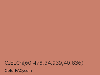 CIELCh 60.478,34.939,40.836 Color is a normal red color and the nearest color is Antique Brass #c88a65. Hex code #c97f6b and RGB value is rgb(201,127,107). In RGB color space, this color is composed of 79% red, 50% green, 42% blue, In CMYK color space, this color is composed of 0% cyan, 37% magenta, 47% yellow , 21% black , In HSL color space, this color has a hue angle of 13° , 47% saturation and 60% lightness.