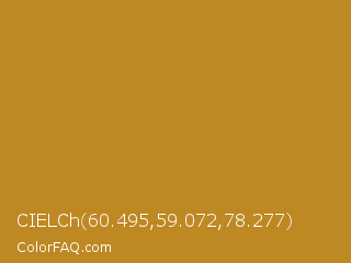 CIELCh 60.495,59.072,78.277 Color is a normal orange color and the nearest color is University Of California Gold #b78727. Hex code #be8823 and RGB value is rgb(190,136,35). In RGB color space, this color is composed of 75% red, 53% green, 14% blue, In CMYK color space, this color is composed of 0% cyan, 28% magenta, 82% yellow , 25% black , In HSL color space, this color has a hue angle of 39° , 69% saturation and 44% lightness.