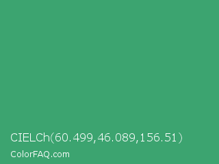CIELCh 60.499,46.089,156.51 Color is a normal green color and the nearest color is Ocean Green #41aa78. Hex code #3ca470 and RGB value is rgb(60,164,112). In RGB color space, this color is composed of 24% red, 64% green, 44% blue, In CMYK color space, this color is composed of 63% cyan, 0% magenta, 32% yellow , 36% black , In HSL color space, this color has a hue angle of 150° , 46% saturation and 44% lightness.