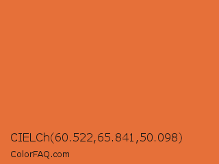 CIELCh 60.522,65.841,50.098 Color is a normal orange color and the nearest color is Deep Carrot Orange #e9692c. Hex code #e67039 and RGB value is rgb(230,112,57). In RGB color space, this color is composed of 90% red, 44% green, 22% blue, In CMYK color space, this color is composed of 0% cyan, 51% magenta, 75% yellow , 10% black , In HSL color space, this color has a hue angle of 19° , 78% saturation and 56% lightness.