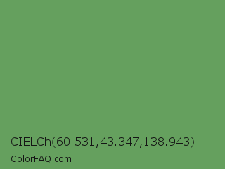 CIELCh 60.531,43.347,138.943 Color is a normal green color and the nearest color is Russian Green #679267. Hex code #65a05e and RGB value is rgb(101,160,94). In RGB color space, this color is composed of 40% red, 63% green, 37% blue, In CMYK color space, this color is composed of 37% cyan, 0% magenta, 41% yellow , 37% black , In HSL color space, this color has a hue angle of 114° , 26% saturation and 50% lightness.