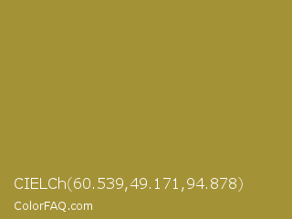 CIELCh 60.539,49.171,94.878 Color is a normal yellow color and the nearest color is Luxor Gold #a7882c. Hex code #a49237 and RGB value is rgb(164,146,55). In RGB color space, this color is composed of 64% red, 57% green, 22% blue, In CMYK color space, this color is composed of 0% cyan, 11% magenta, 66% yellow , 36% black , In HSL color space, this color has a hue angle of 50° , 50% saturation and 43% lightness.