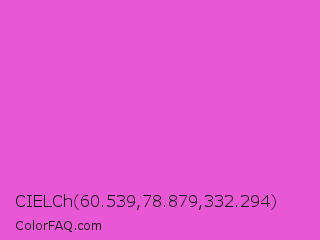 CIELCh 60.539,78.879,332.294 Color is a light magenta color and the nearest color is Purple Pizzazz #fe4eda. Hex code #e857d4 and RGB value is rgb(232,87,212). In RGB color space, this color is composed of 91% red, 34% green, 83% blue, In CMYK color space, this color is composed of 0% cyan, 63% magenta, 9% yellow , 9% black , In HSL color space, this color has a hue angle of 308° , 76% saturation and 63% lightness.