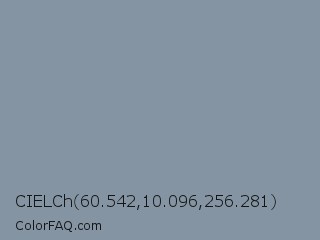 CIELCh 60.542,10.096,256.281 Color is a normal blue color and the nearest color is Regent Gray #86949f. Hex code #8494a3 and RGB value is rgb(132,148,163). In RGB color space, this color is composed of 52% red, 58% green, 64% blue, In CMYK color space, this color is composed of 19% cyan, 9% magenta, 0% yellow , 36% black , In HSL color space, this color has a hue angle of 209° , 14% saturation and 58% lightness.