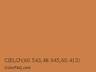 CIELCh 60.543,48.945,60.413 Color is a normal orange color and the nearest color is Raw Sienna Crayola #d27d46. Hex code #cc8047 and RGB value is rgb(204,128,71). In RGB color space, this color is composed of 80% red, 50% green, 28% blue, In CMYK color space, this color is composed of 0% cyan, 37% magenta, 65% yellow , 20% black , In HSL color space, this color has a hue angle of 26° , 57% saturation and 54% lightness.
