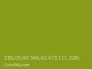 CIELCh 60.566,62.673,111.228 Color is a normal yellow color and the nearest color is Trendy Green #7c881a. Hex code #889b1b and RGB value is rgb(136,155,27). In RGB color space, this color is composed of 53% red, 61% green, 11% blue, In CMYK color space, this color is composed of 12% cyan, 0% magenta, 83% yellow , 39% black , In HSL color space, this color has a hue angle of 69° , 70% saturation and 36% lightness.