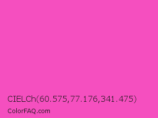 CIELCh 60.575,77.176,341.475 Color is a light magenta color and the nearest color is Light Deep Pink #ff5ccd. Hex code #f54fbf and RGB value is rgb(245,79,191). In RGB color space, this color is composed of 96% red, 31% green, 75% blue, In CMYK color space, this color is composed of 0% cyan, 68% magenta, 22% yellow , 4% black , In HSL color space, this color has a hue angle of 320° , 89% saturation and 64% lightness.