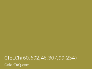 CIELCh 60.602,46.307,99.254 Color is a normal yellow color and the nearest color is Sycamore #908d39. Hex code #9e943e and RGB value is rgb(158,148,62). In RGB color space, this color is composed of 62% red, 58% green, 24% blue, In CMYK color space, this color is composed of 0% cyan, 6% magenta, 61% yellow , 38% black , In HSL color space, this color has a hue angle of 54° , 44% saturation and 43% lightness.