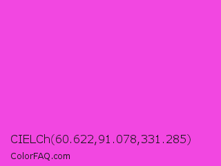 CIELCh 60.622,91.078,331.285 Color is a light magenta color and the nearest color is Purple Pizzazz #fe4eda. Hex code #f247e1 and RGB value is rgb(242,71,225). In RGB color space, this color is composed of 95% red, 28% green, 88% blue, In CMYK color space, this color is composed of 0% cyan, 71% magenta, 7% yellow , 5% black , In HSL color space, this color has a hue angle of 306° , 87% saturation and 61% lightness.