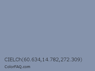 CIELCh 60.634,14.782,272.309 Color is a normal blue color and the nearest color is Cool Grey #8c92ac. Hex code #8593ac and RGB value is rgb(133,147,172). In RGB color space, this color is composed of 52% red, 58% green, 67% blue, In CMYK color space, this color is composed of 23% cyan, 15% magenta, 0% yellow , 33% black , In HSL color space, this color has a hue angle of 218° , 19% saturation and 60% lightness.